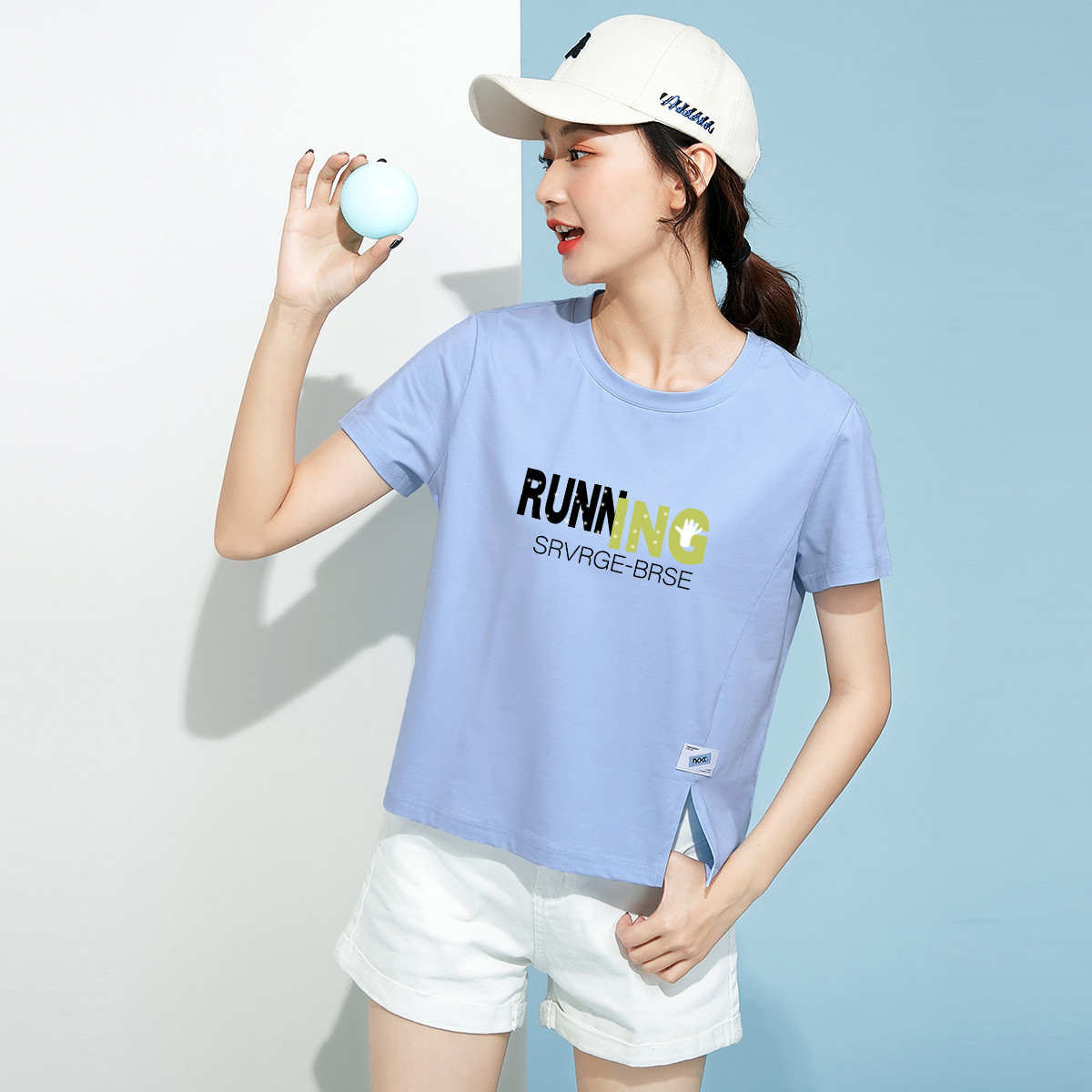 米子旗夏季款圆领女式T恤字母印花下摆开叉宽松短袖上衣 639898