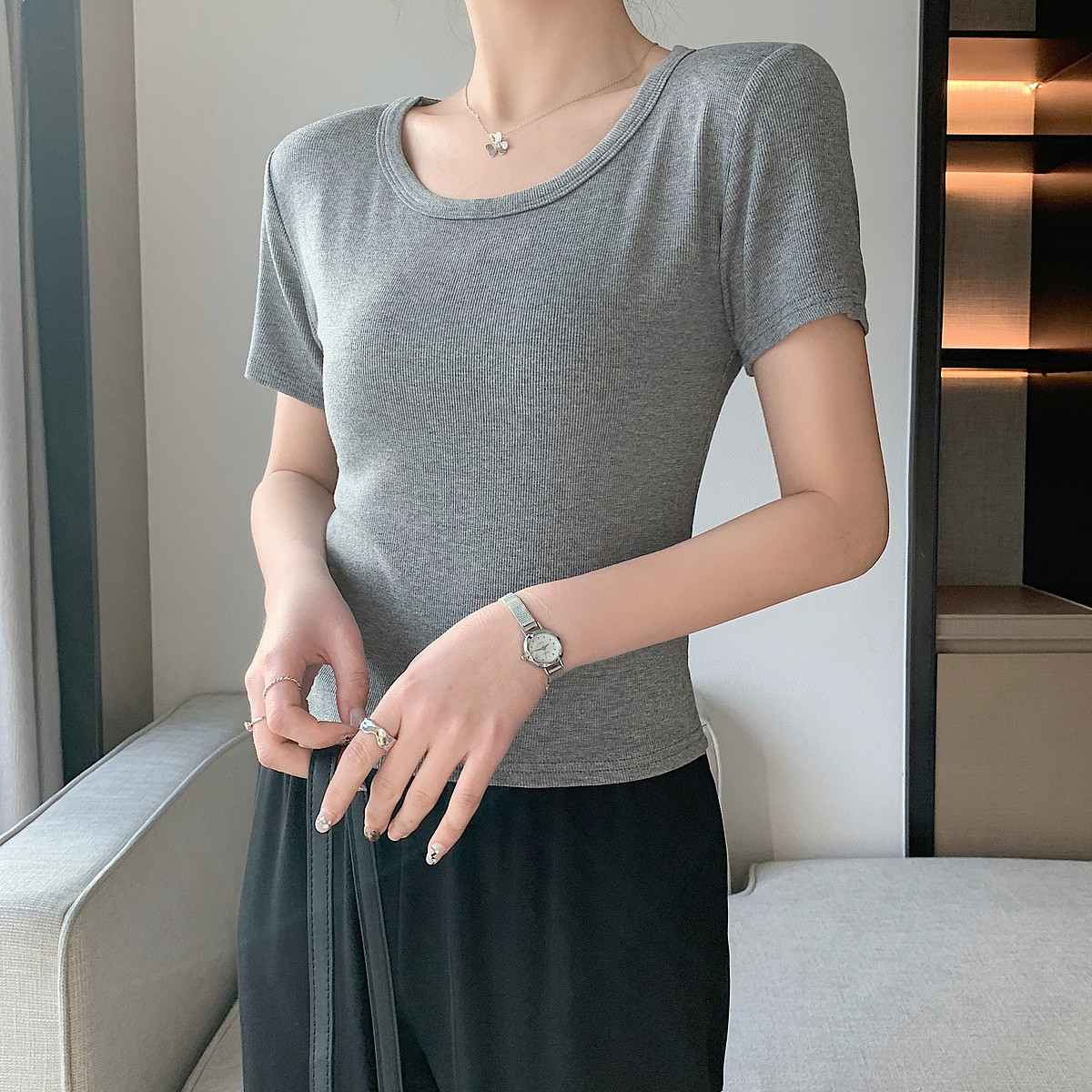 【大圆领高弹修身女式t恤】夏气质修身短袖t恤女 350977