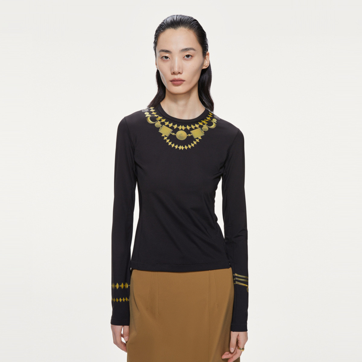 米子旗春秋款圆领女式T恤纯色宽松下摆开叉设计长袖上衣 544474