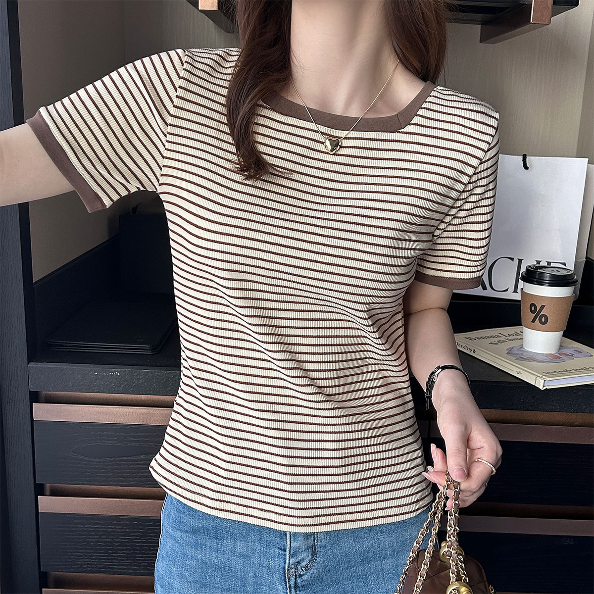 精美条纹T恤女夏季新款时尚女装上衣T恤休闲简约舒适女士t恤衫 057985