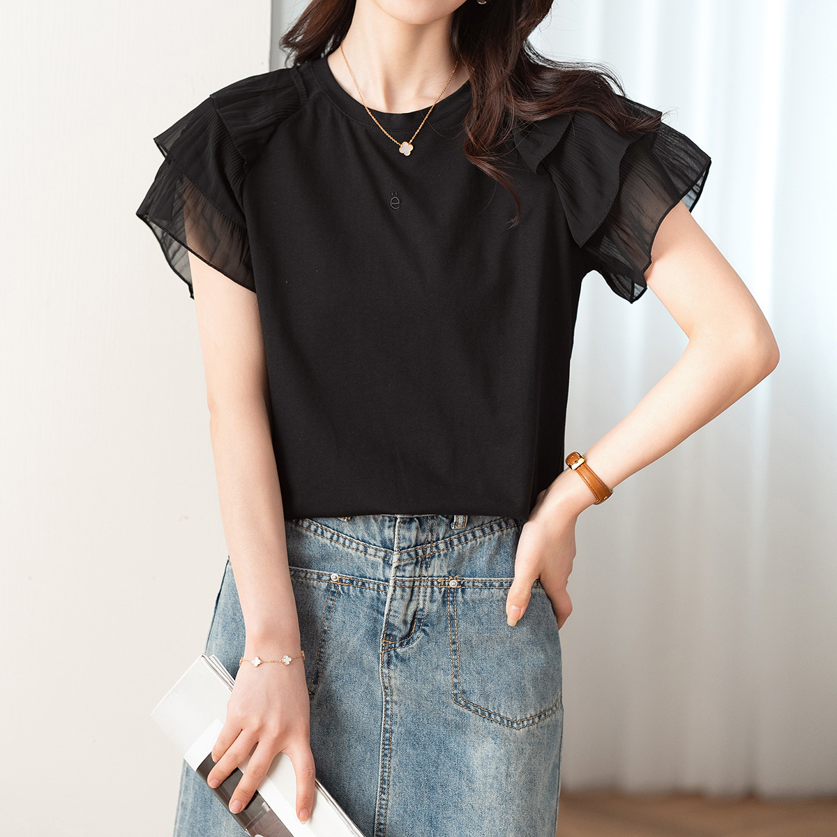 夏季小香风立体网纱时尚拼接肩膀气质名媛短袖T恤衫 222424