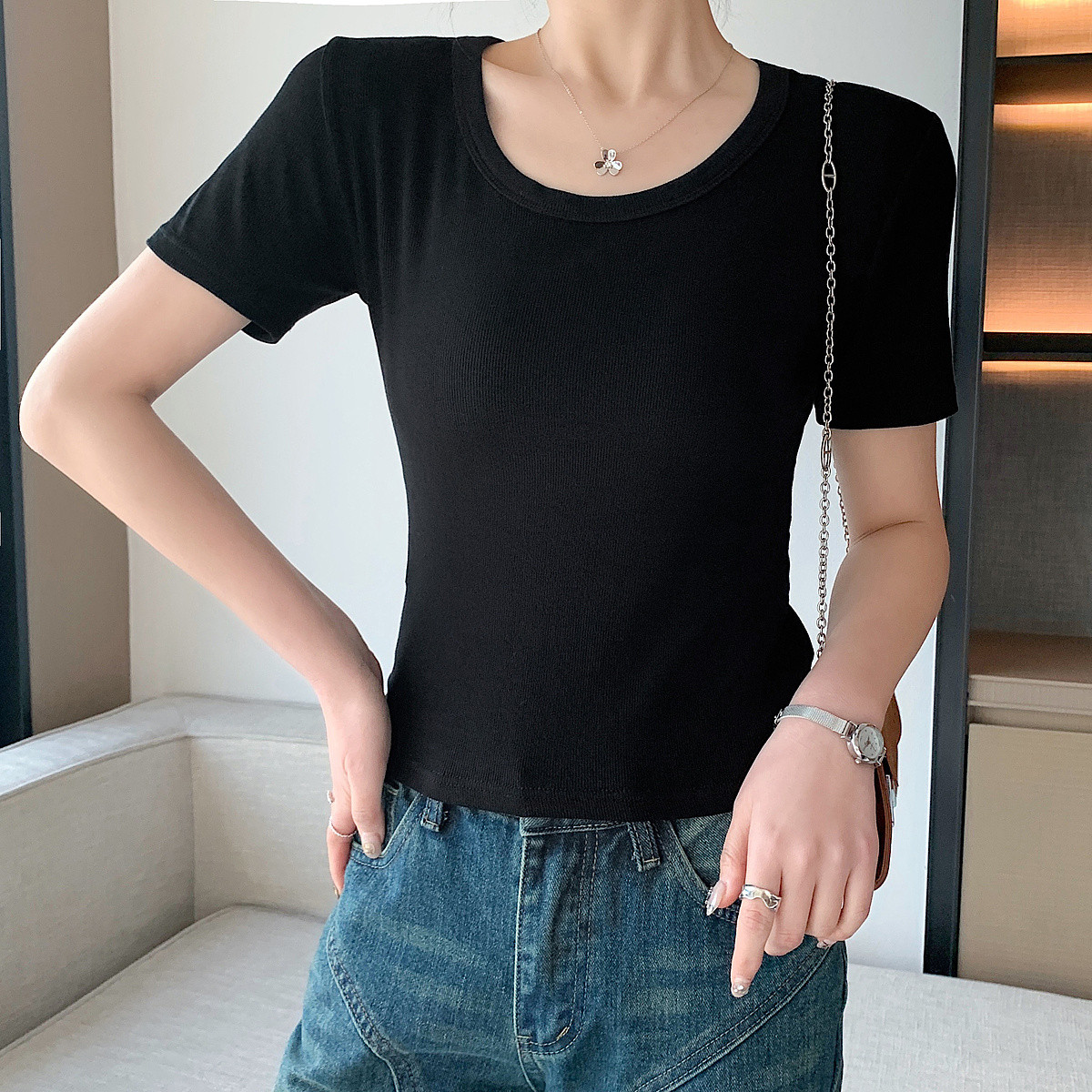 【大圆领高弹修身女式t恤】夏气质修身短袖t恤女 342785