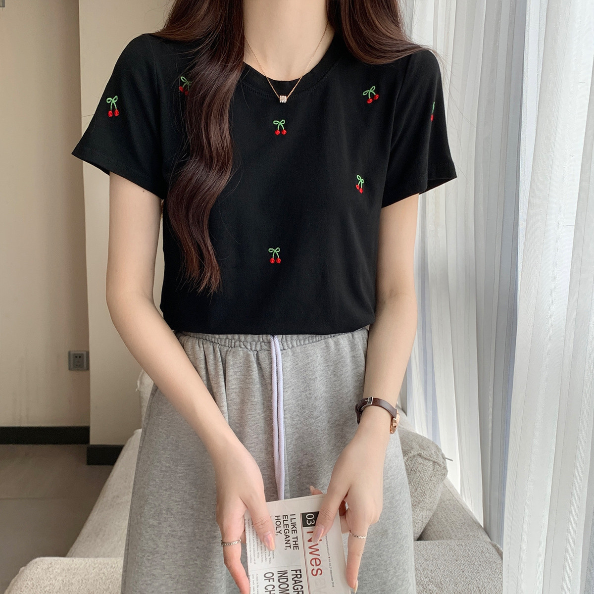 温柔甜美风圆领短袖t恤女简约时尚打底衫百搭绣花女衬衫 944387