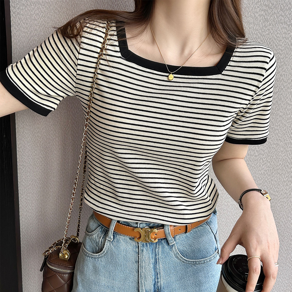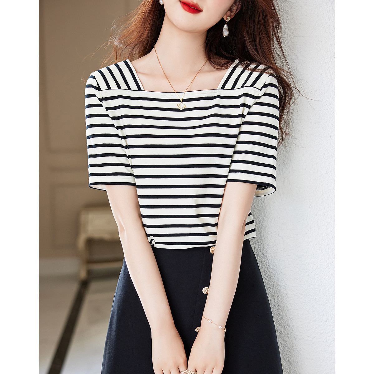 【法式复古方领条纹女式t恤】夏季精梳棉短袖t恤女 104065
