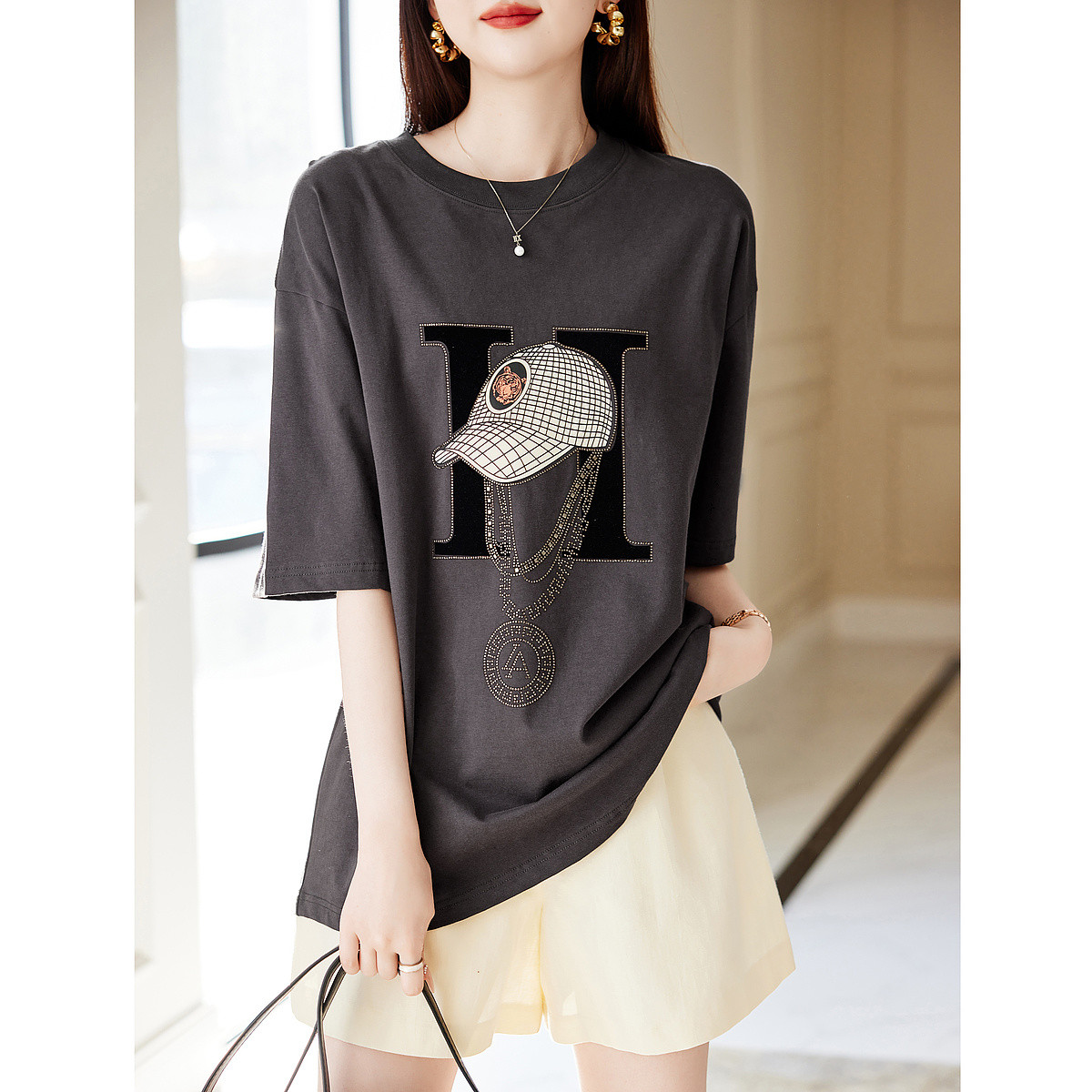 【时尚烫钻女式t恤】夏款圆领宽松短袖t恤女中长款 928961