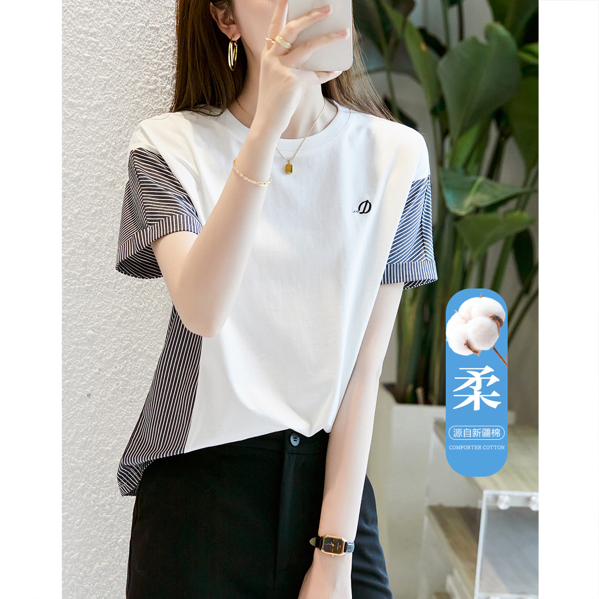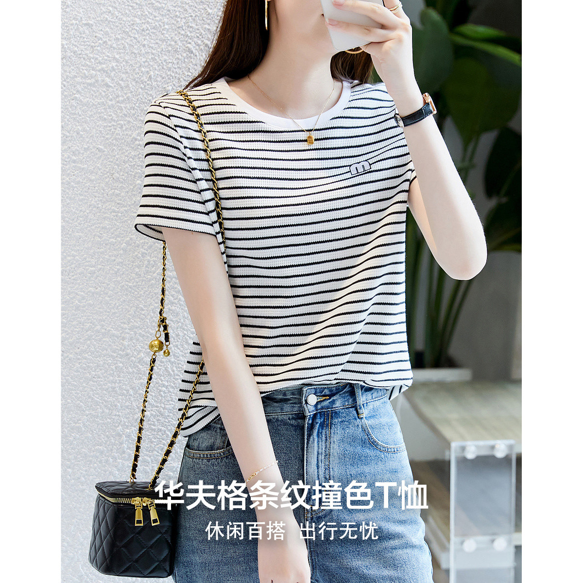 【上班穿搭】夏高支云感纯棉绣花短袖t恤女时髦撞色条纹女式t恤 501057