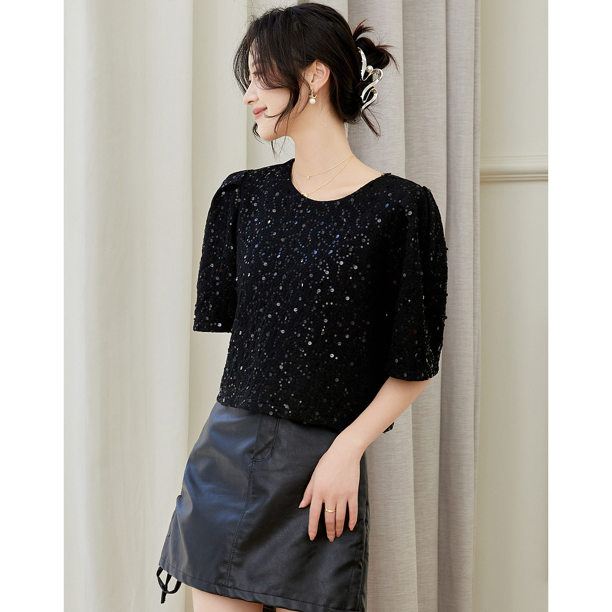 【气质亮片女式t恤】夏季圆领宽松微弹简约t恤女 161409