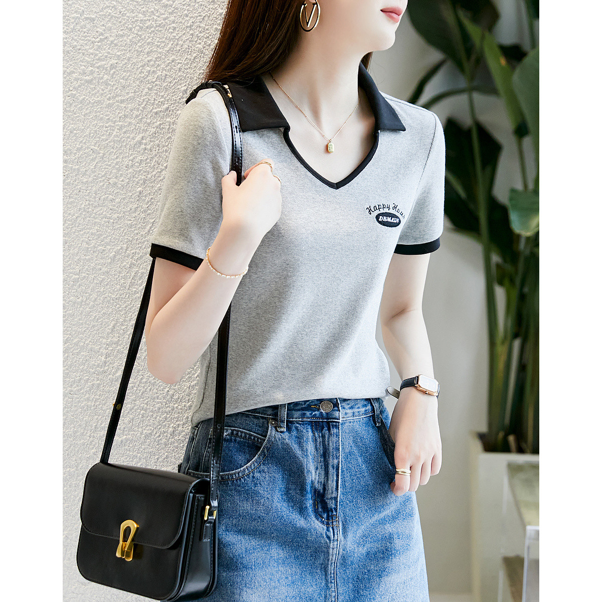 【精梳棉字母绣花女式t恤】夏翻领微弹短袖t恤女 152193