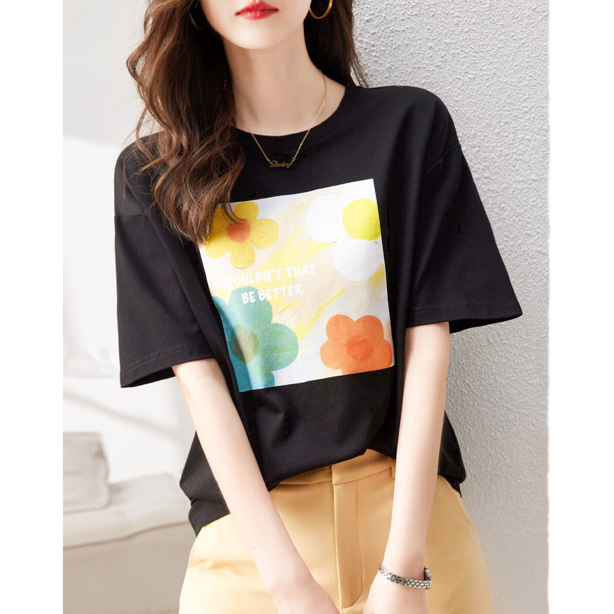 【印花t恤】春秋圆领宽松落肩袖植物花卉短袖t恤上衣女 216833