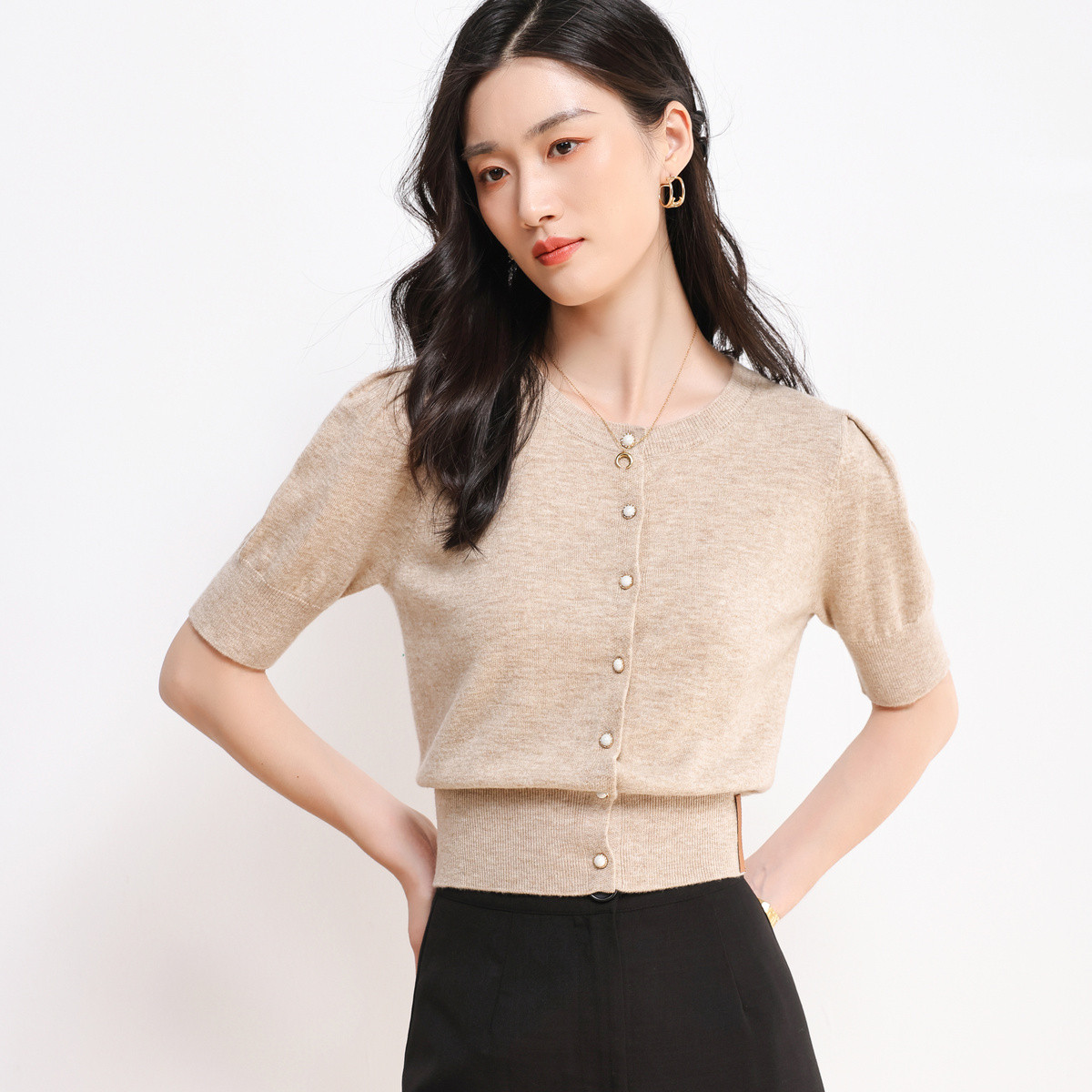 【100%绵羊毛】纯色泡泡袖圆领短袖羊毛开衫针织T恤毛衣外套 622611
