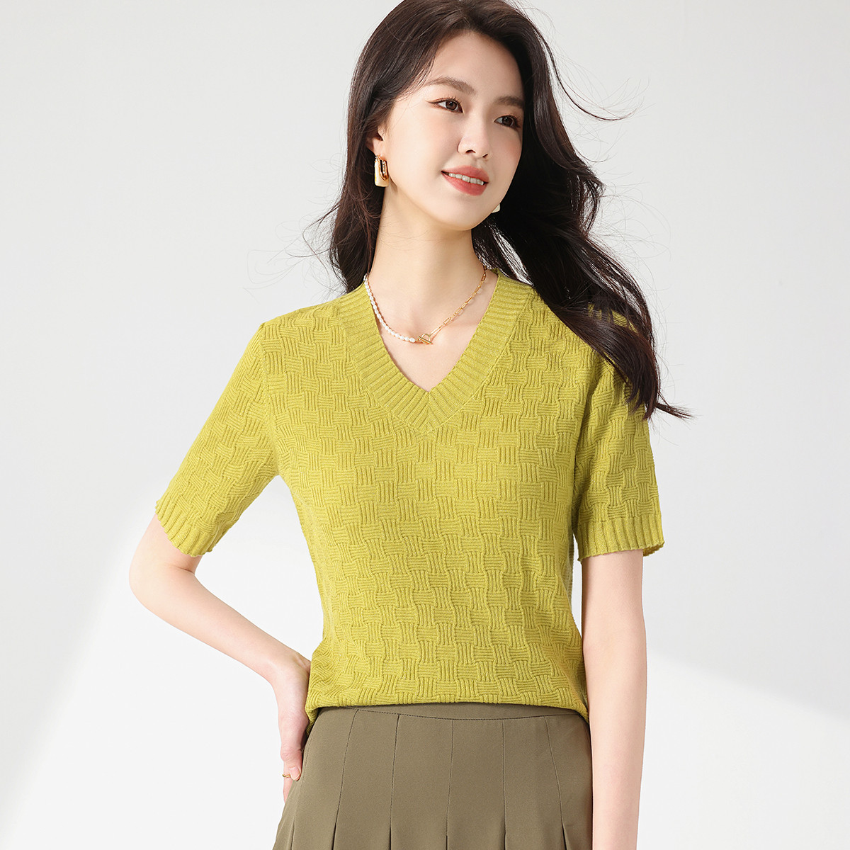 轻薄透气基础简约V领含绵羊毛针织打底衫短袖T恤毛衣 542163