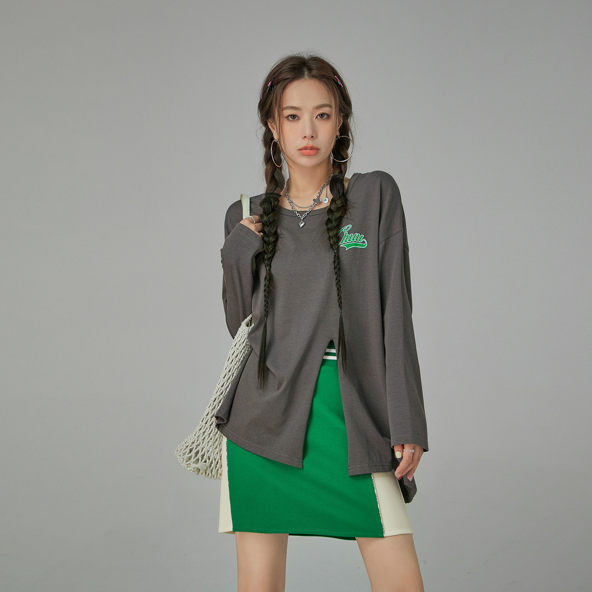米子旗春秋款圆领女式T恤纯色宽松下摆开叉设计长袖上衣 544474