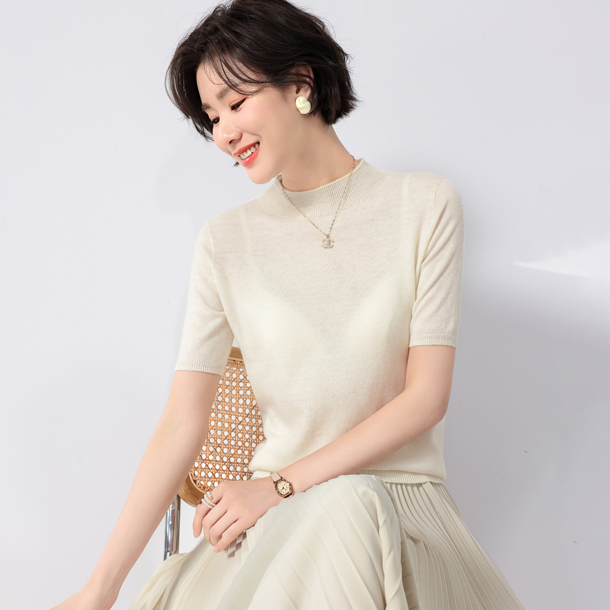 【100%绵羊毛】无缝纯色半高领织衫修身短袖T恤女式羊毛衫春 960979