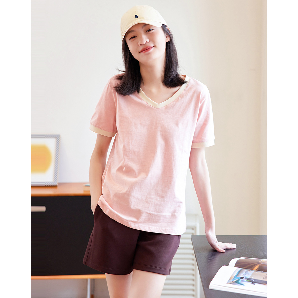 【V领领口袖口撞色修身T恤】春款短袖女款T恤 647938