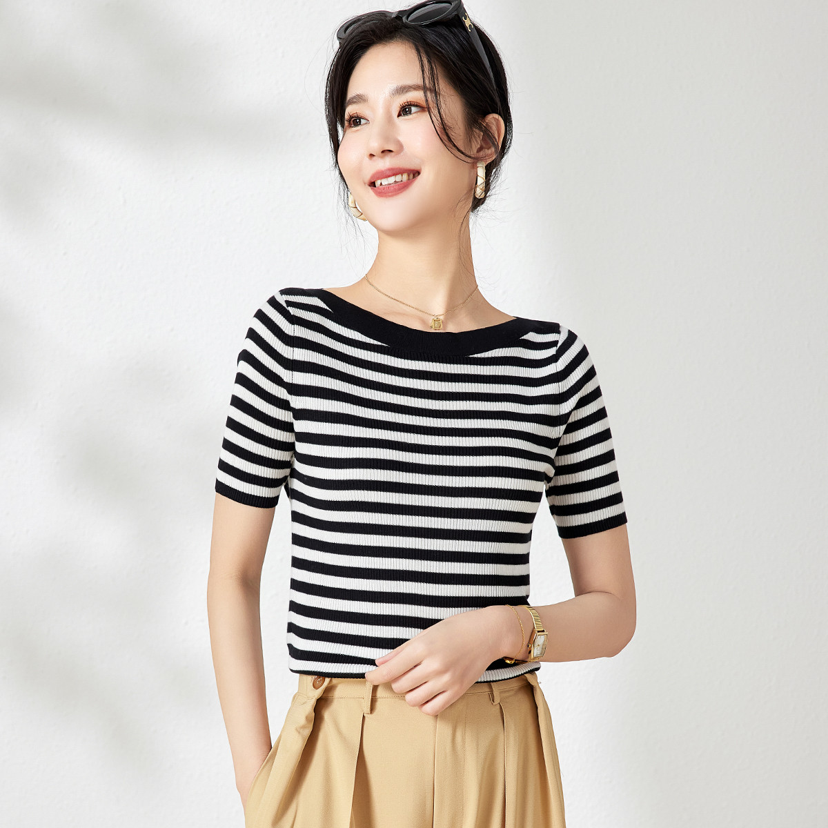 时尚休闲一字领撞色条纹含桑蚕丝短袖针织衫女打底衫T恤女夏轻薄 803091
