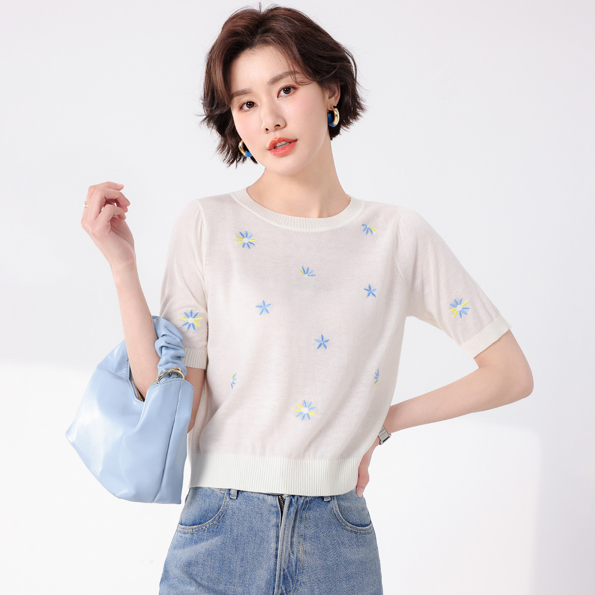 轻薄透气简约绣花圆领针织打底短袖T恤羊毛衫毛衣 167443