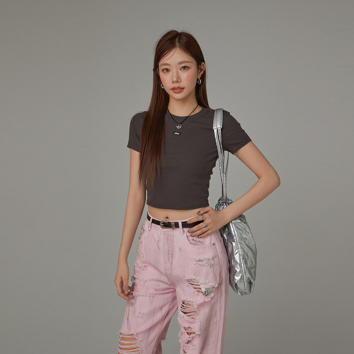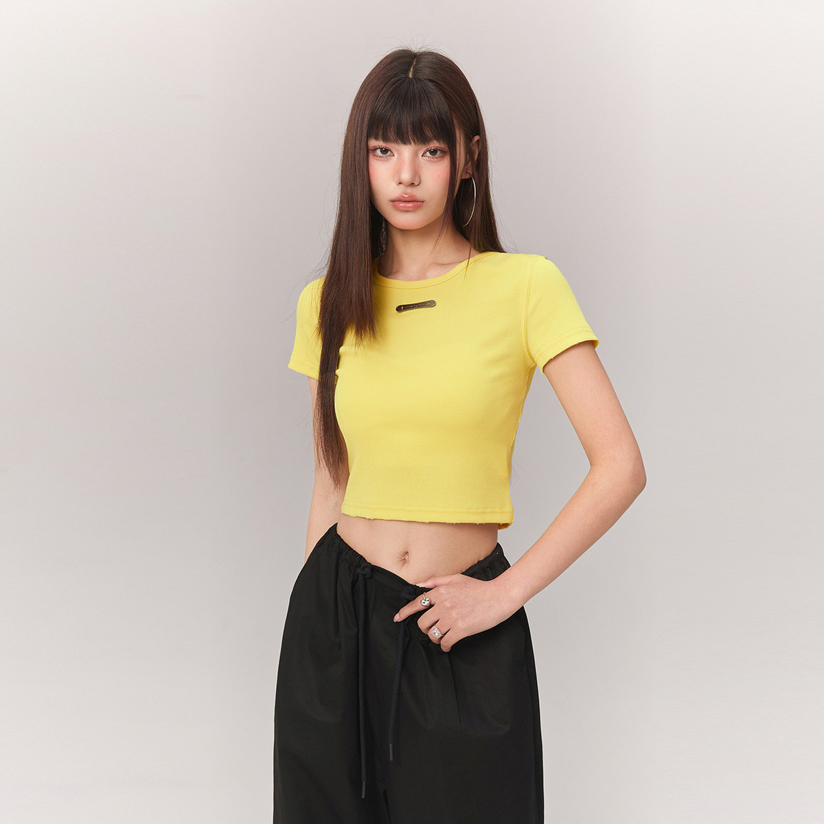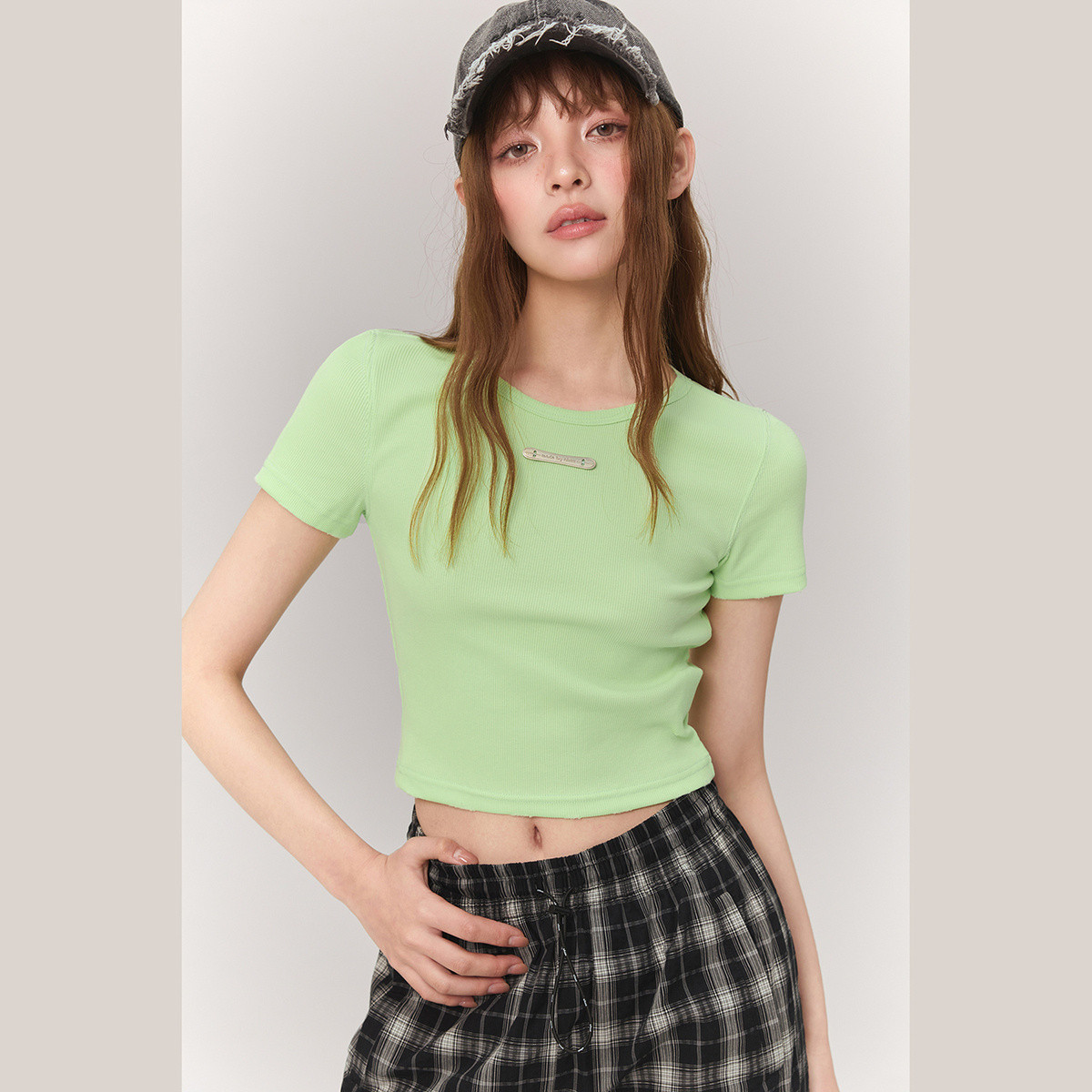 金属标磨破短袖T恤女2025夏辣妹修身圆领打底短上衣 283731