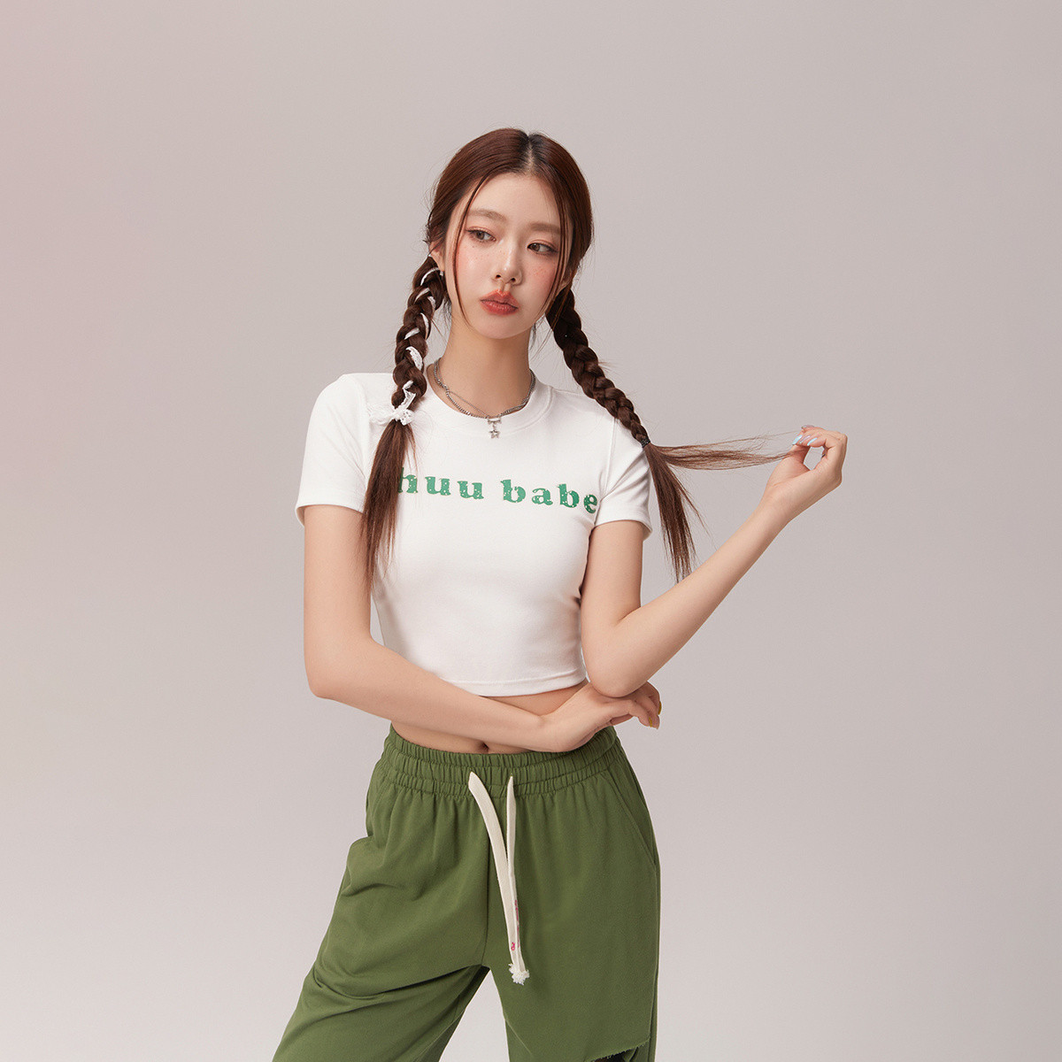 字母印花正肩T恤女2025夏辣妹修身基础学院短袖上衣 507347