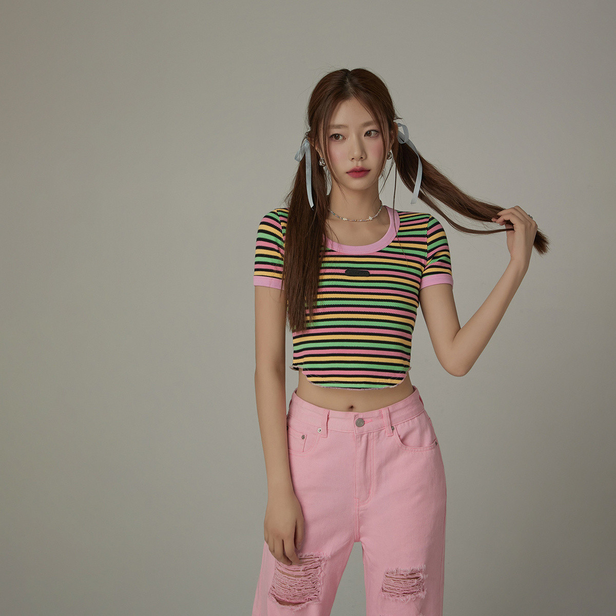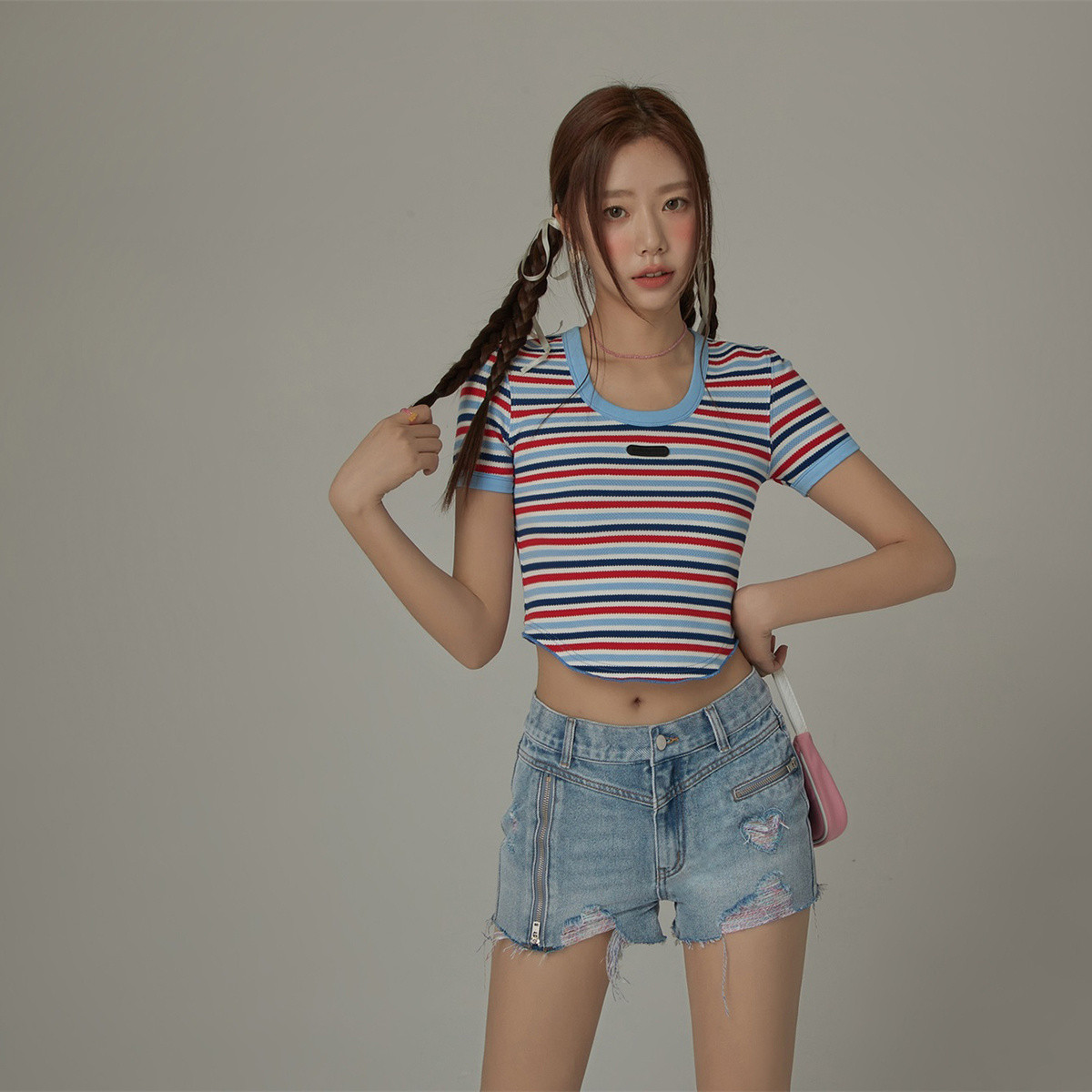 彩条纹圆领T恤女士2025春夏甜美拼接修身显瘦短袖上衣 498259