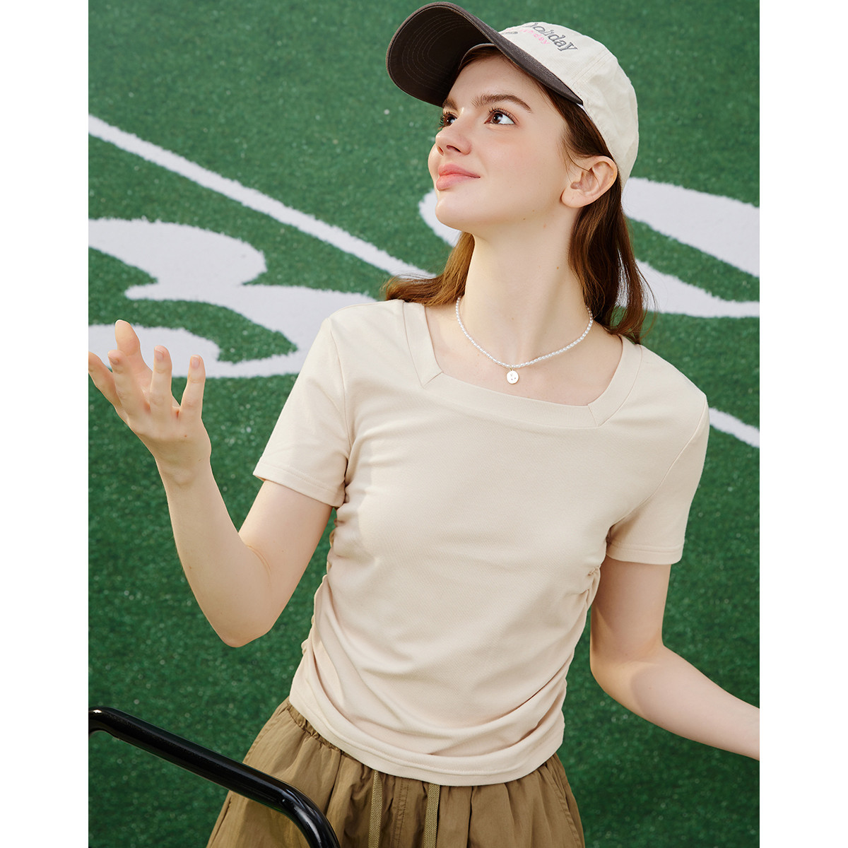 纯色简约方领抽褶设计短袖上衣夏季休闲修身女式T恤 032861