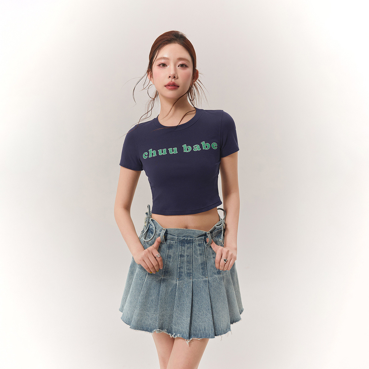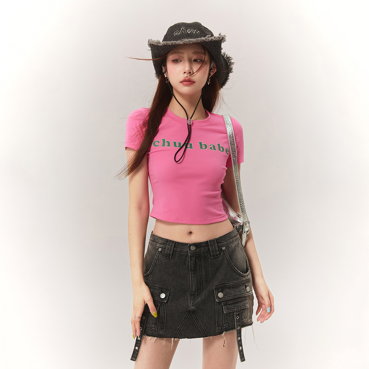 字母印花正肩T恤女2025夏辣妹修身基础学院短袖上衣 134035