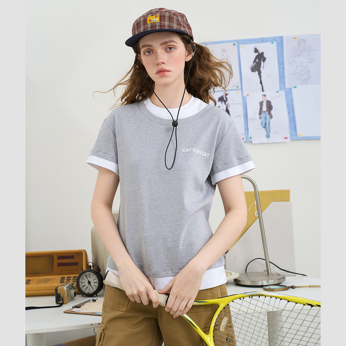假两件拼接简约修身印花短袖上衣2025夏季百搭休闲女式T恤 569565