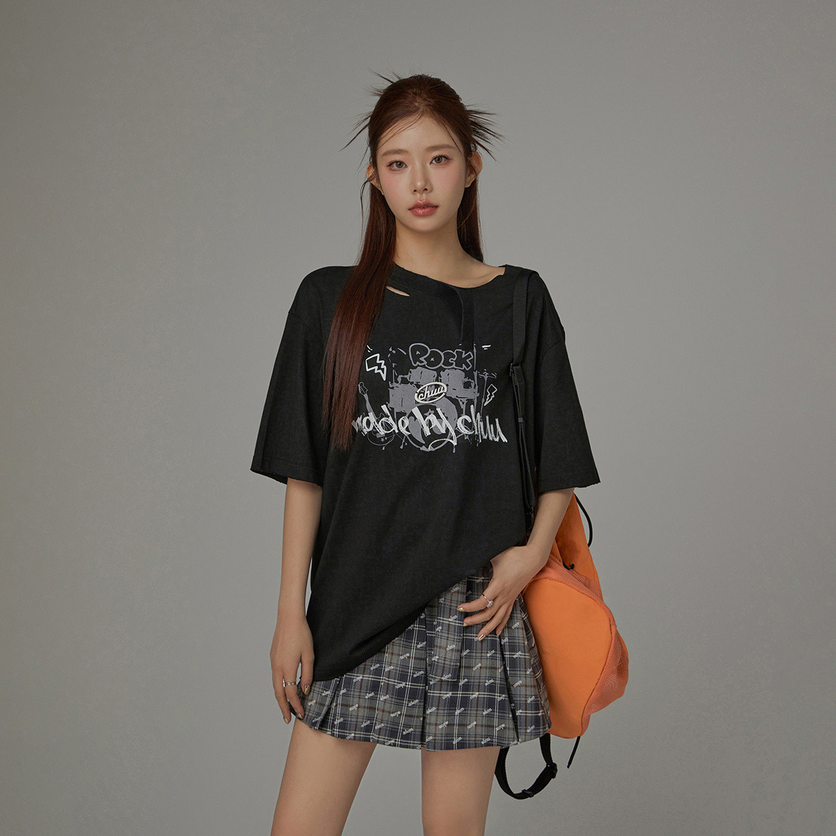 卡通字母印花T恤女2025夏破洞镂空磨破宽松短袖上衣 232659