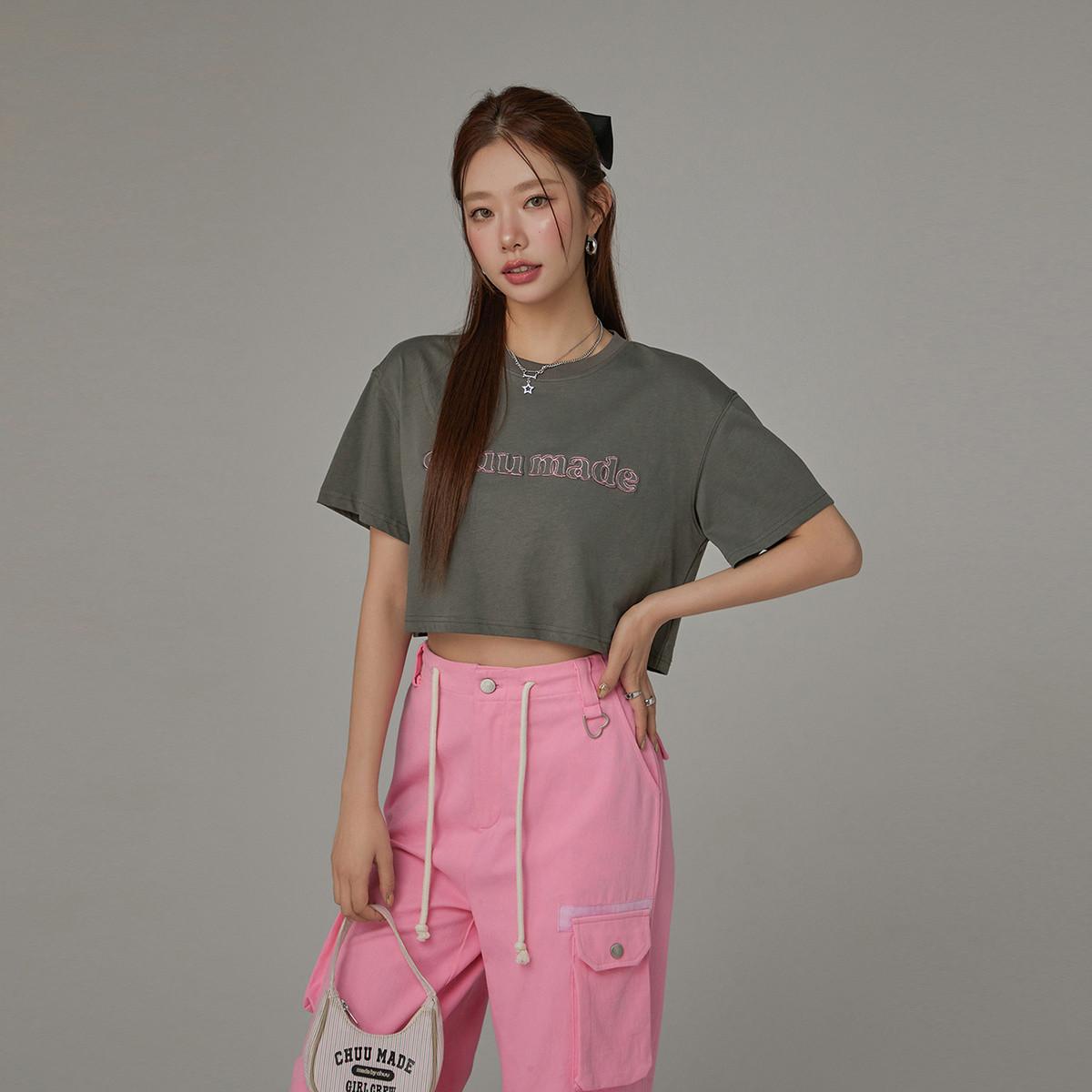 字母贴布绣短袖T恤女2025夏圆领宽松打底衫短款上衣 282131