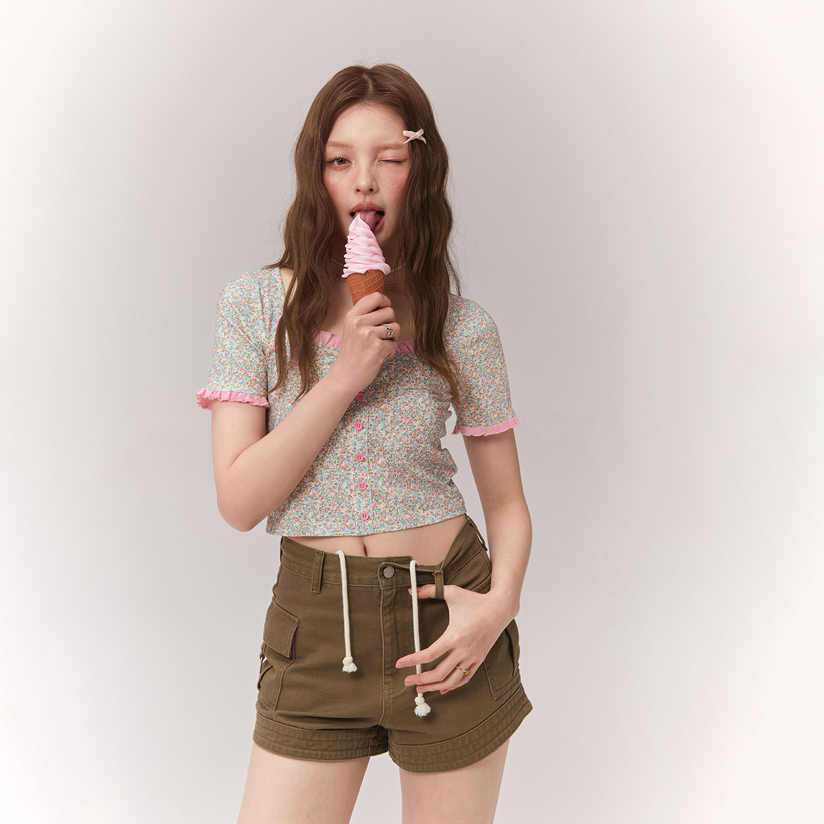 字母碎花T恤女2025春夏修身显瘦洋气甜美减龄短款上衣 355347