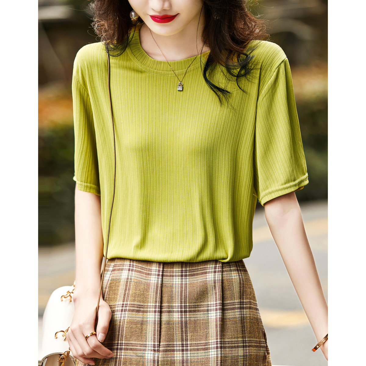 【针织绞花女式t恤】夏季通勤圆领微弹休闲短袖t恤女 263553