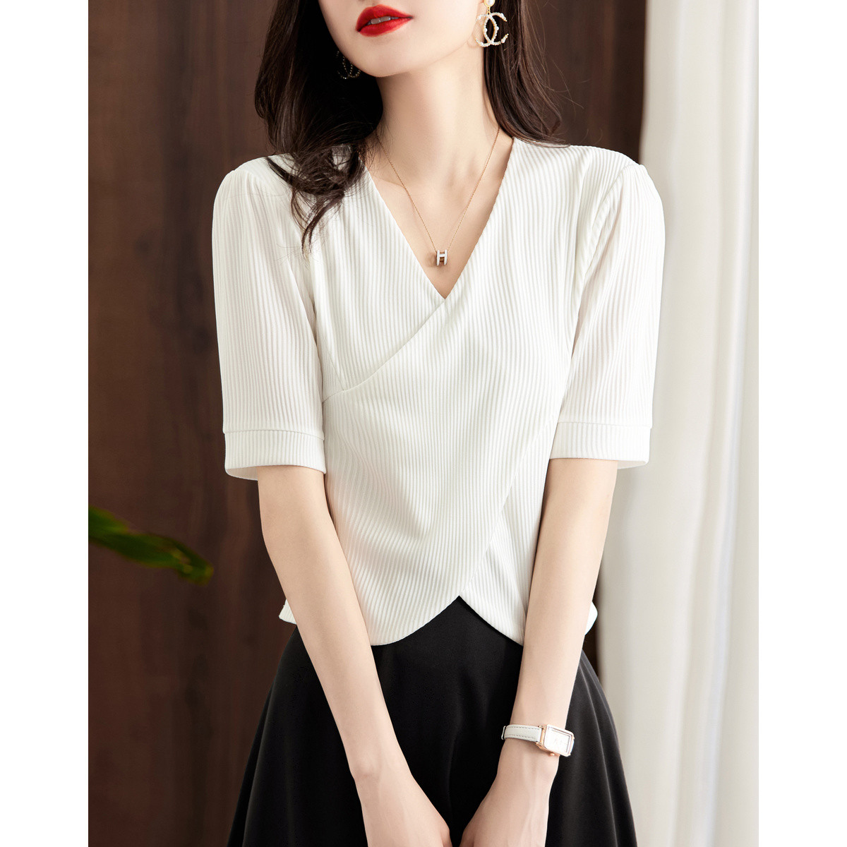 【v领纯棉白t】夏款简约网红风经典百搭V领短袖T恤女 510722