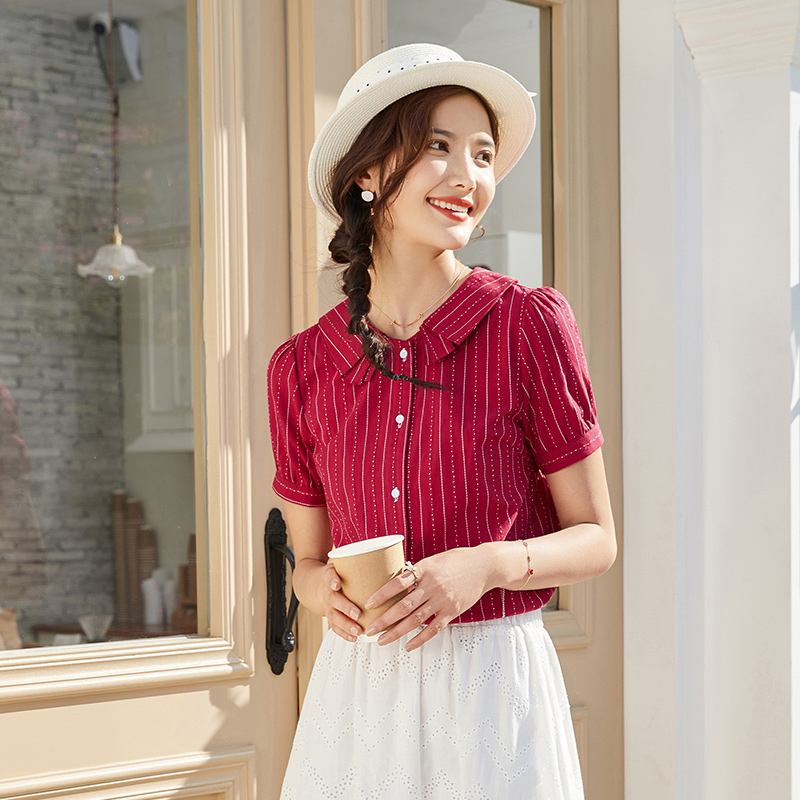 艾路丝婷纯棉短袖衬衫女2021夏装新款韩版宽松上衣娃娃领条纹衬衣