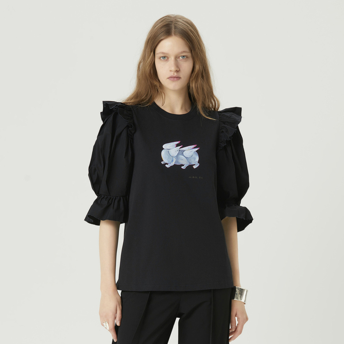 设计感压褶开叉t恤女短款年印花修身显瘦不规则短袖上衣 619096