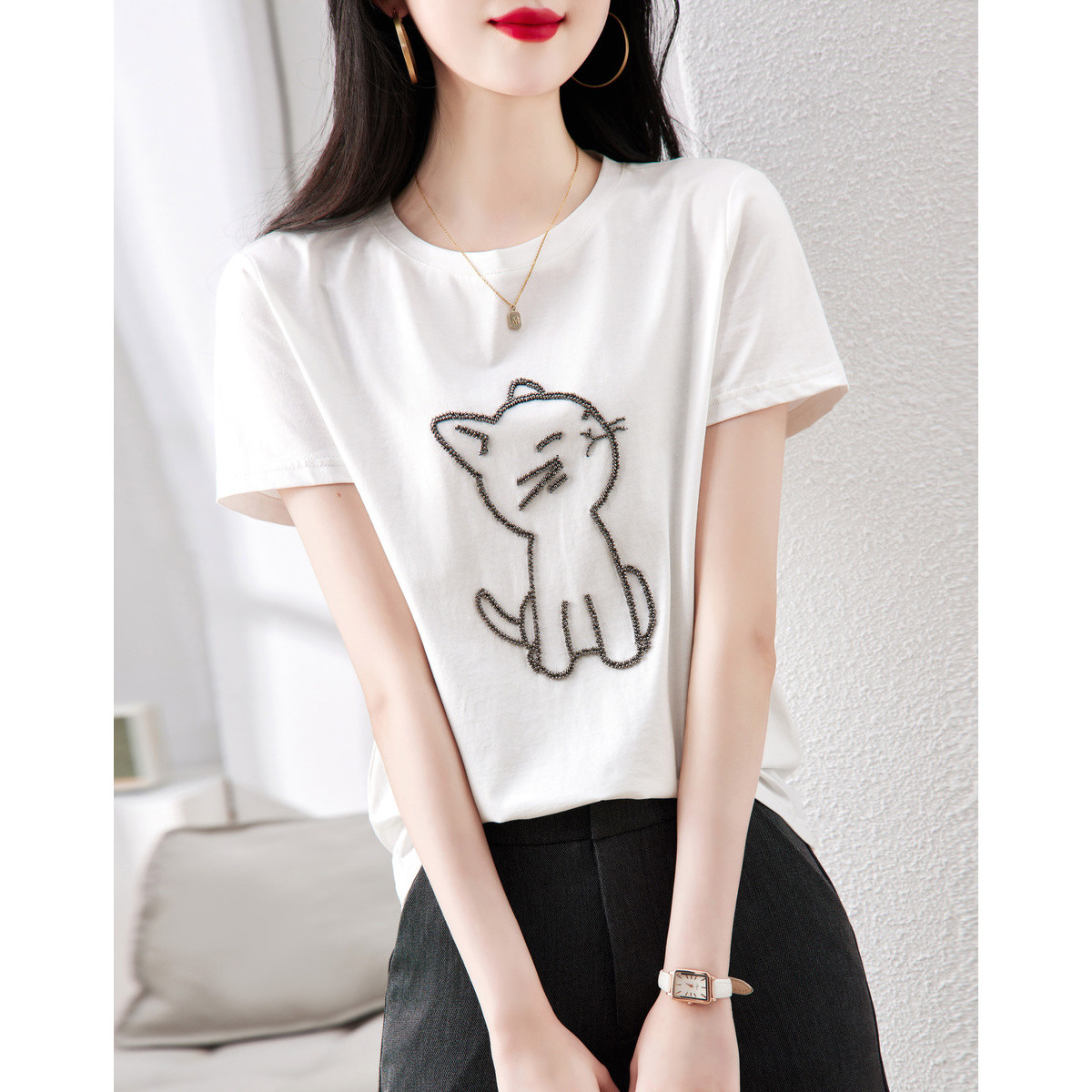【创意钉珠工艺】夏季款圆领女式t恤短袖t恤女 327425