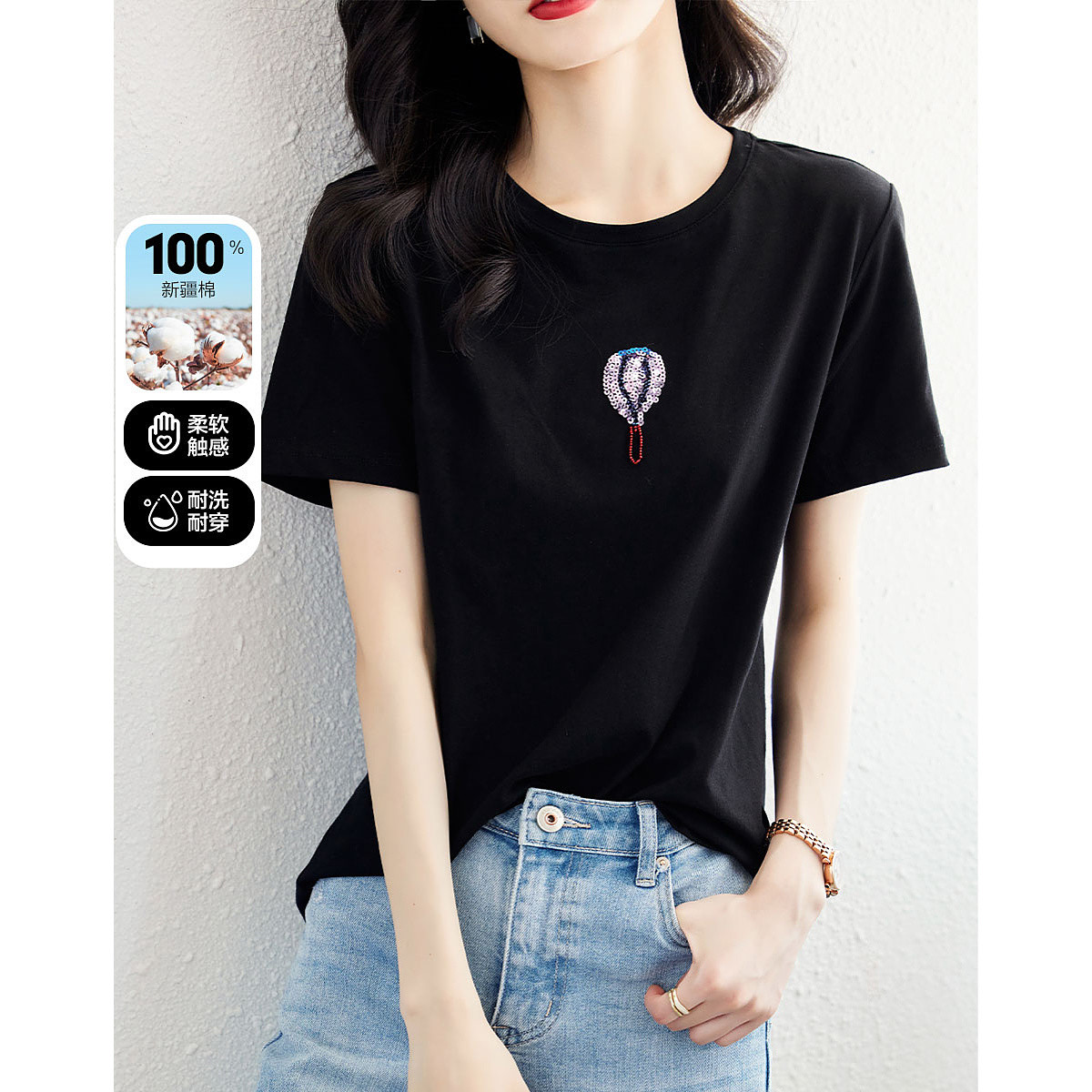 【双倍时髦】夏学院风呼吸感纯棉短袖t恤减龄热气球亮片女式t恤 593665
