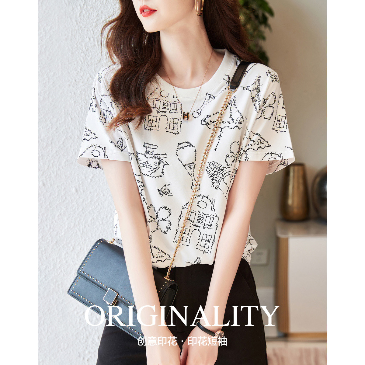 【100%棉】夏季简约通勤款休闲短袖女式百搭舒适圆领上衣小众 219416