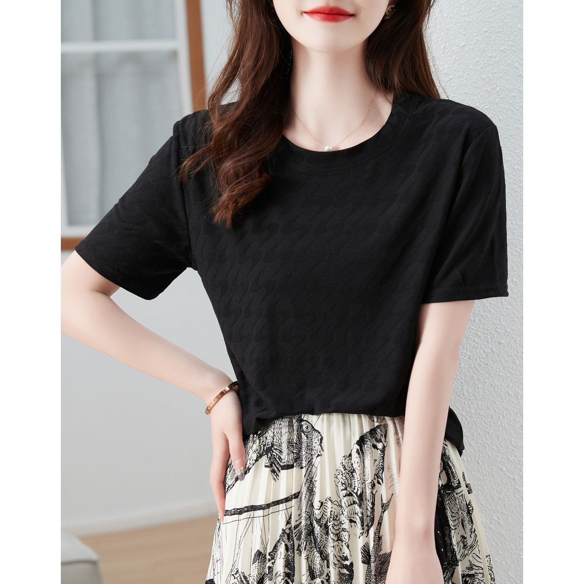 【S纹提花工艺】夏圆领短袖t恤女微弹简约通勤女式t恤 650689