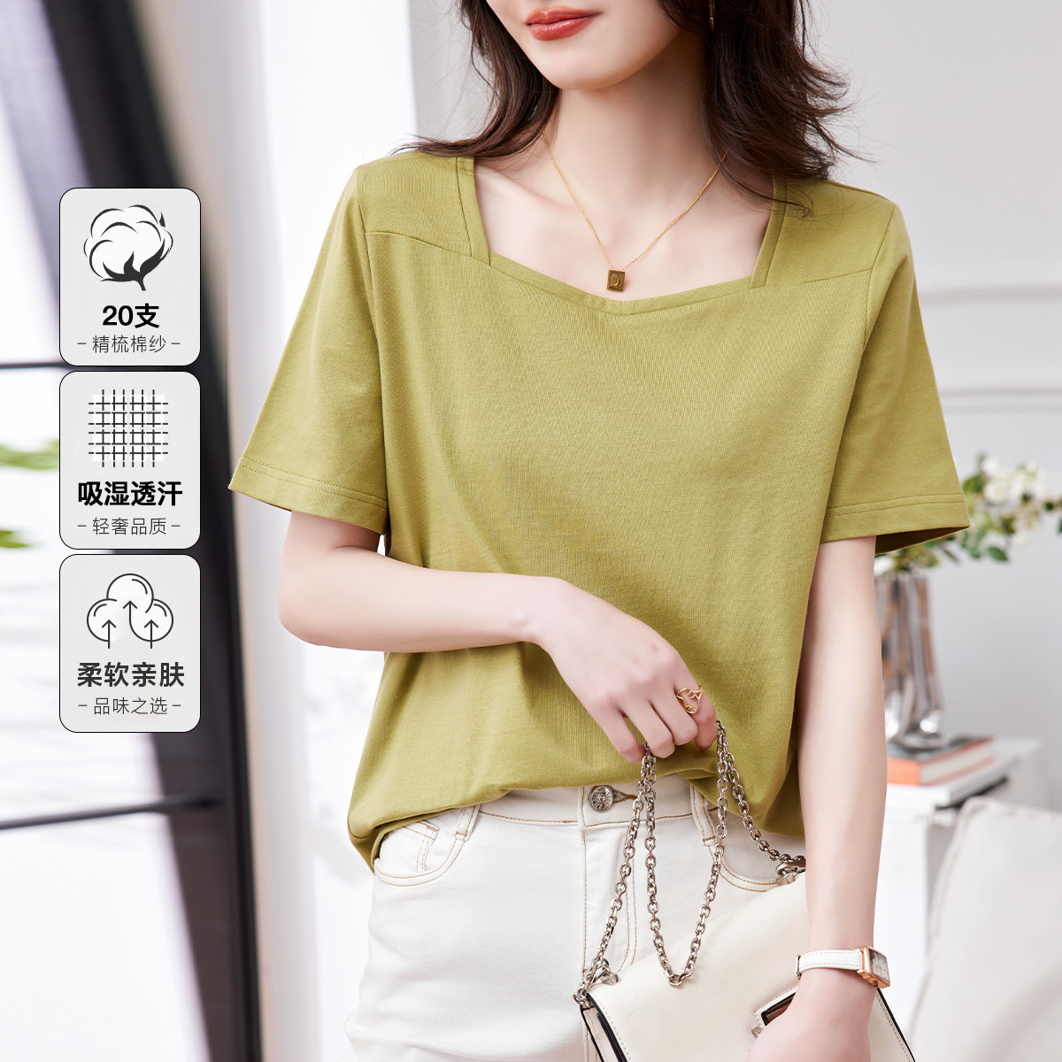 【简约时尚】夏季款方领女式t恤休闲百搭短袖t恤女式 768513