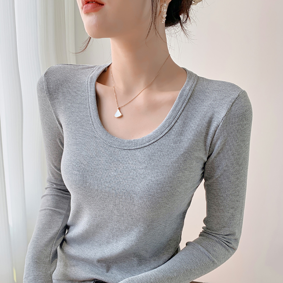 U型领长袖t恤女内搭基础性感锁骨修身长袖针织t恤女 225539