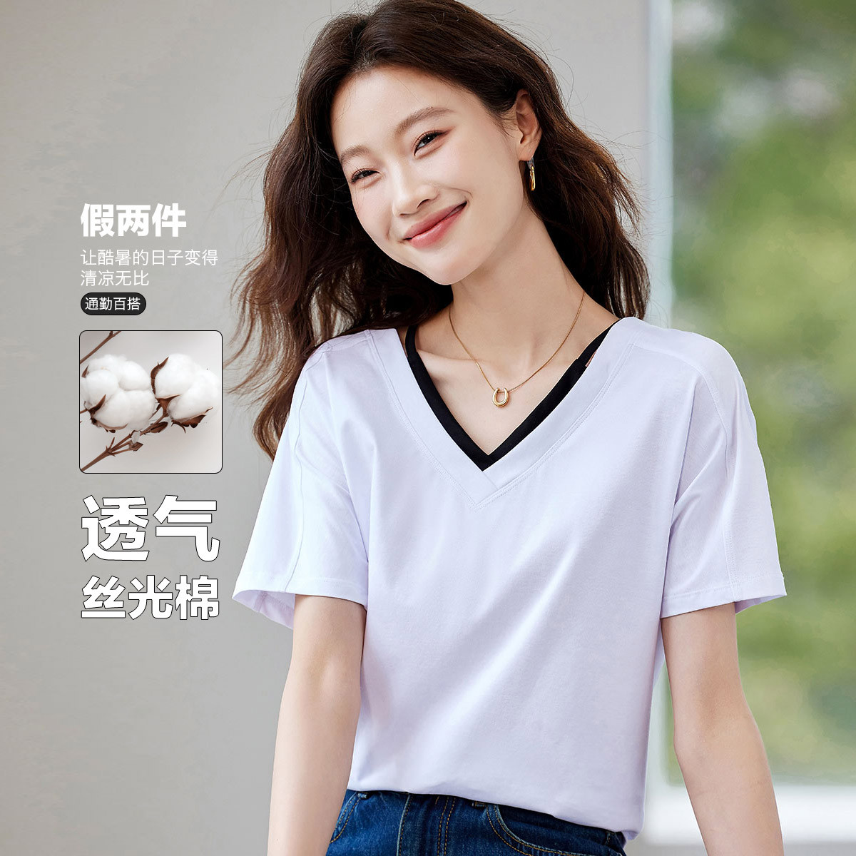 【丝光棉】假两件拼色t恤夏季宽松遮肉女式短袖简约上衣女 204575