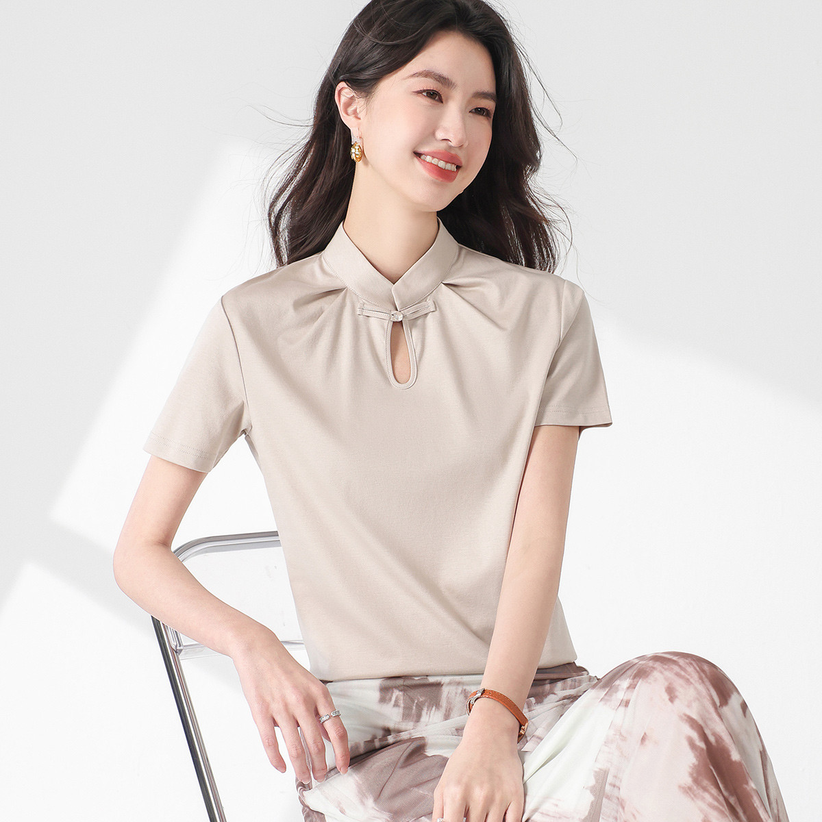 【新中式】旗袍领纯色短袖T恤含桑蚕丝上衣 306963