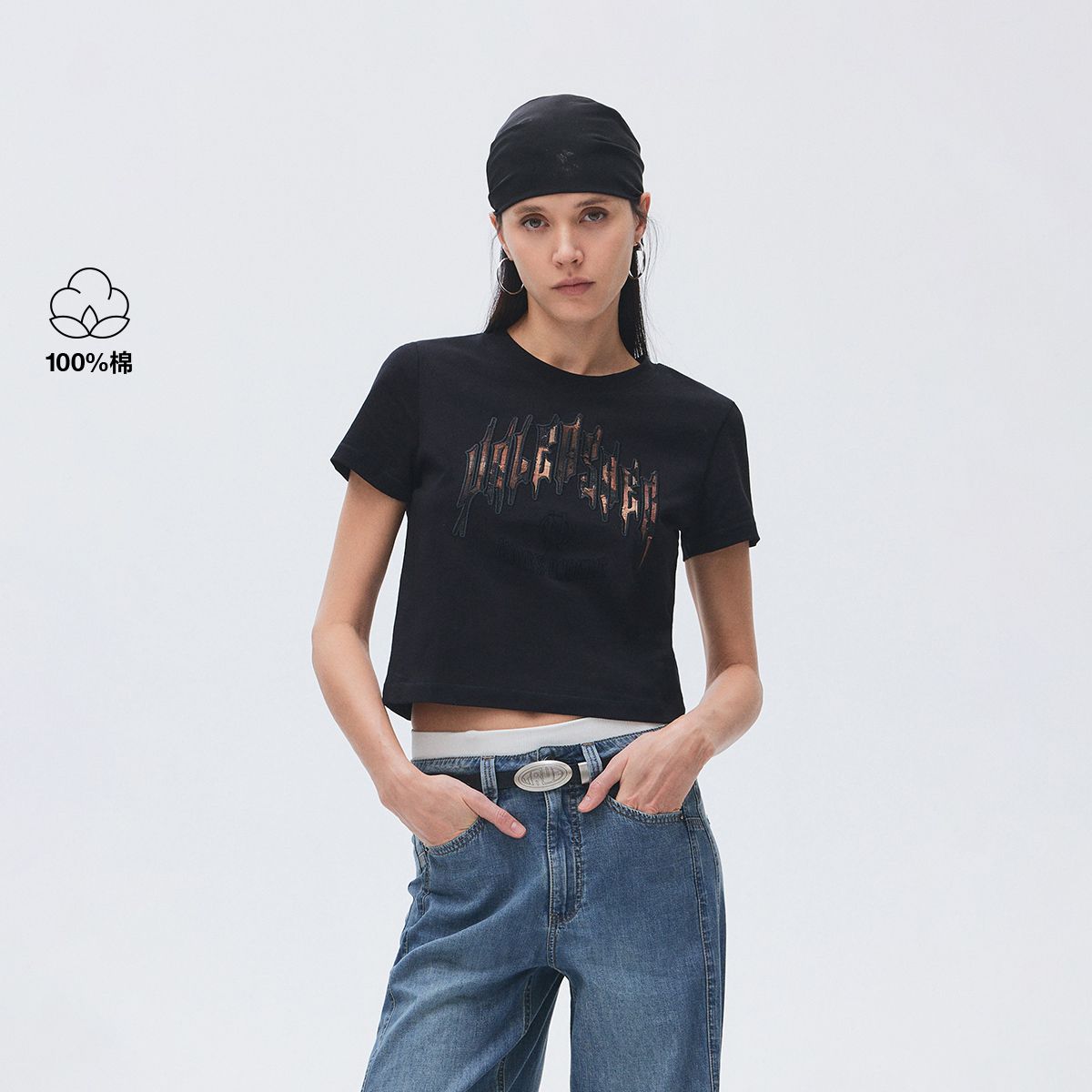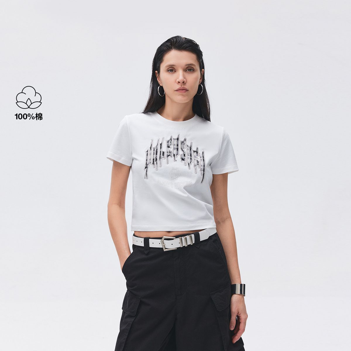 【正肩圆领】2025夏季纯棉潮酷拼接立体刺绣短款T恤女 228570