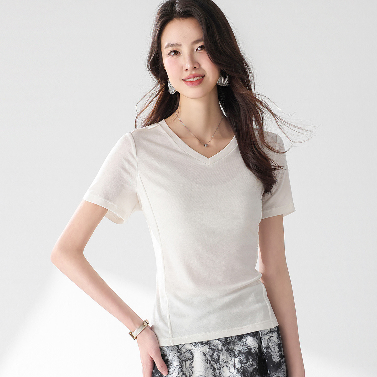 含桑蚕丝~夏装V领纯色女士T恤针织T恤薄款百搭气质上衣 238483