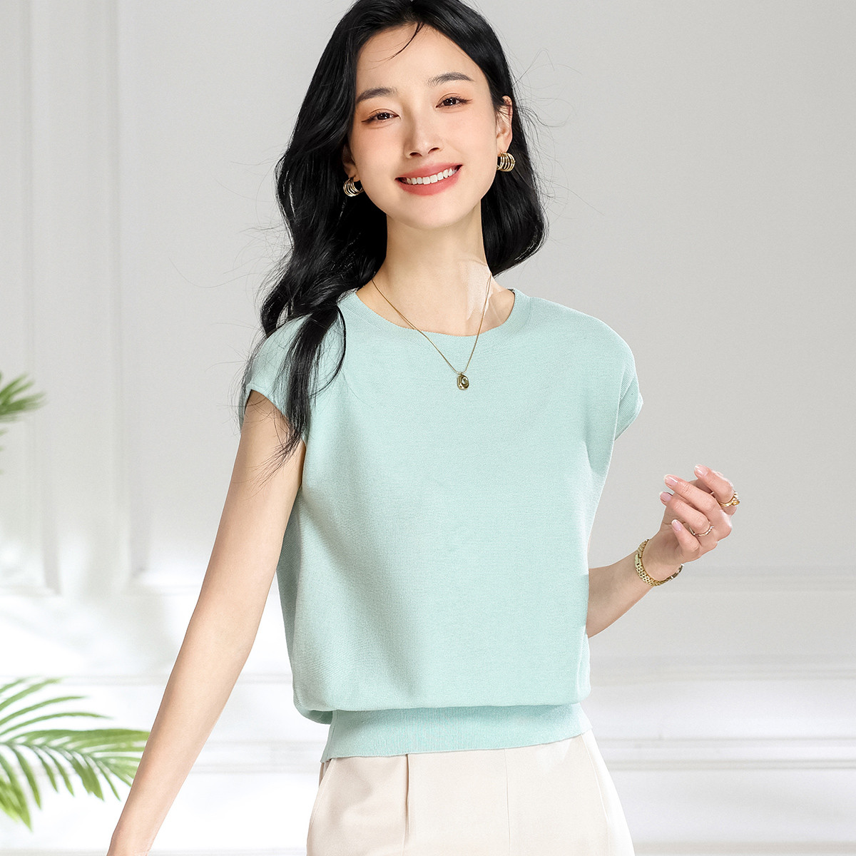 圆领纯色简约桑蚕丝T恤女时尚舒适无袖夏季薄款针织衫小衫 445715