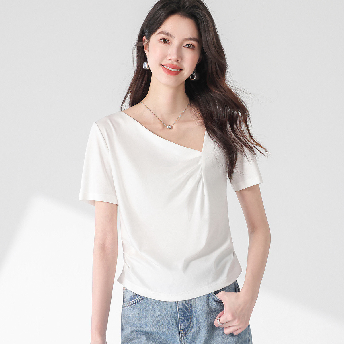 【含桑蚕丝】夏装不规则领纯色短袖T恤女设计感简约上衣 222547
