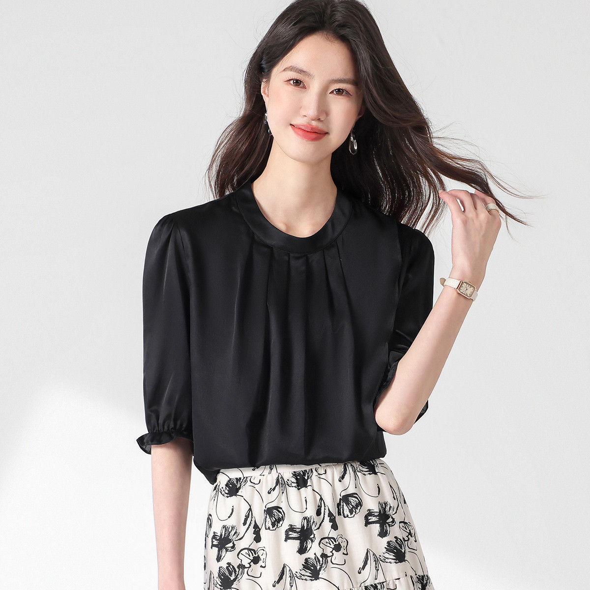 圆领纯色短袖T恤抽褶桑蚕丝上衣女衬衣 311059