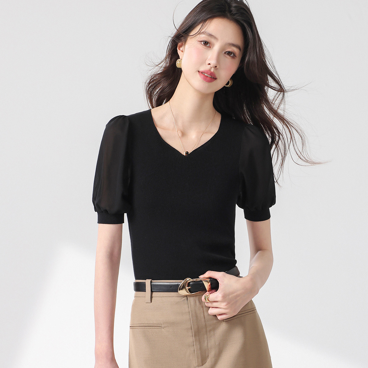夏款V领纯色泡泡袖薄款针织T恤含桑蚕丝女士短袖上衣 421139