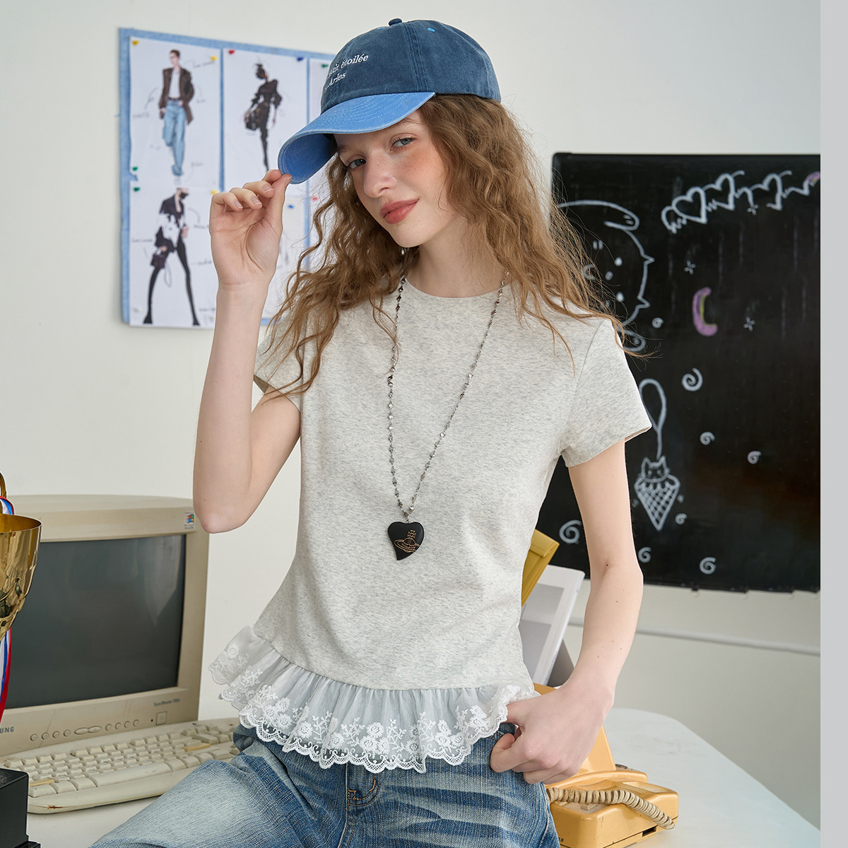 韩系简约圆领荷叶蕾丝花边短袖上衣2025夏季百搭休闲女式T恤 497693