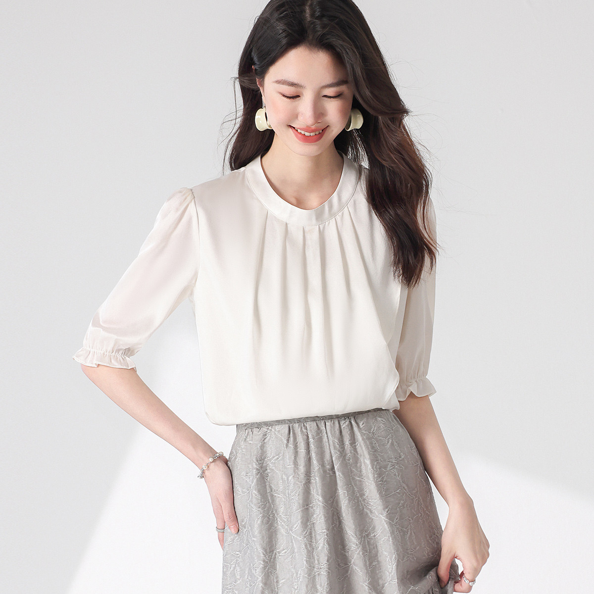 圆领纯色短袖T恤抽褶桑蚕丝上衣女衬衣 294675