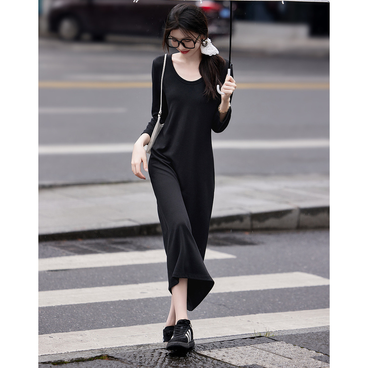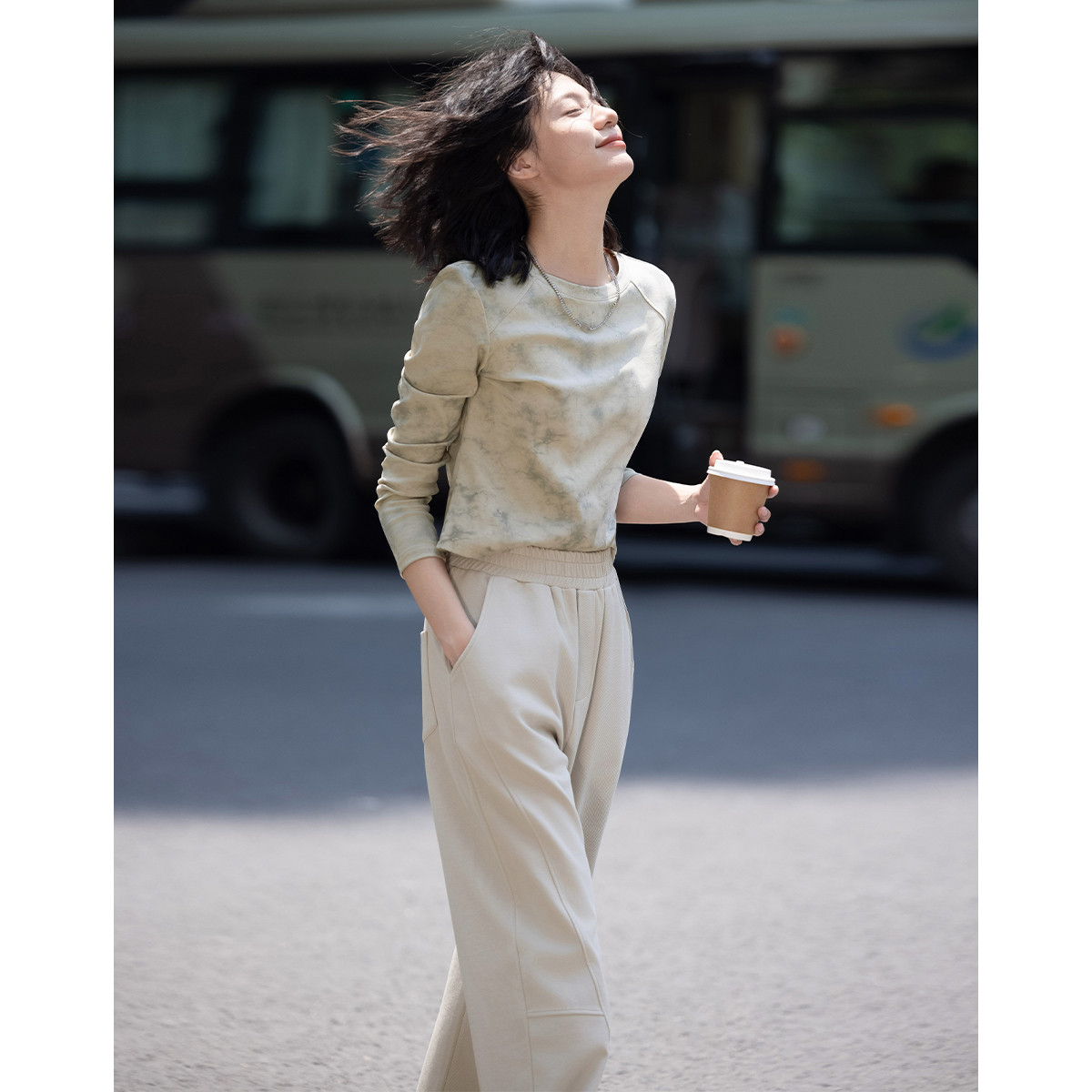 米子旗春秋款圆领女式T恤纯色宽松下摆开叉设计长袖上衣 544474